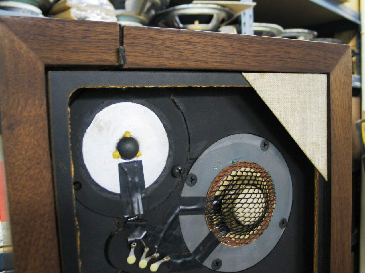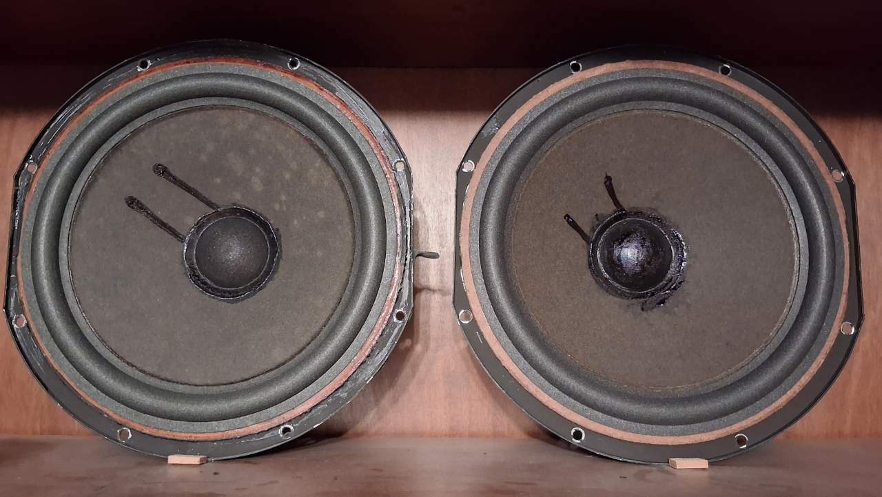 ...tra questi due woofer, quello a sinistra è del '70 ed ha un fs leggermente inferiore al fratello destro del '74, ma ritengo che non si noterà nell' ascolto differenza.