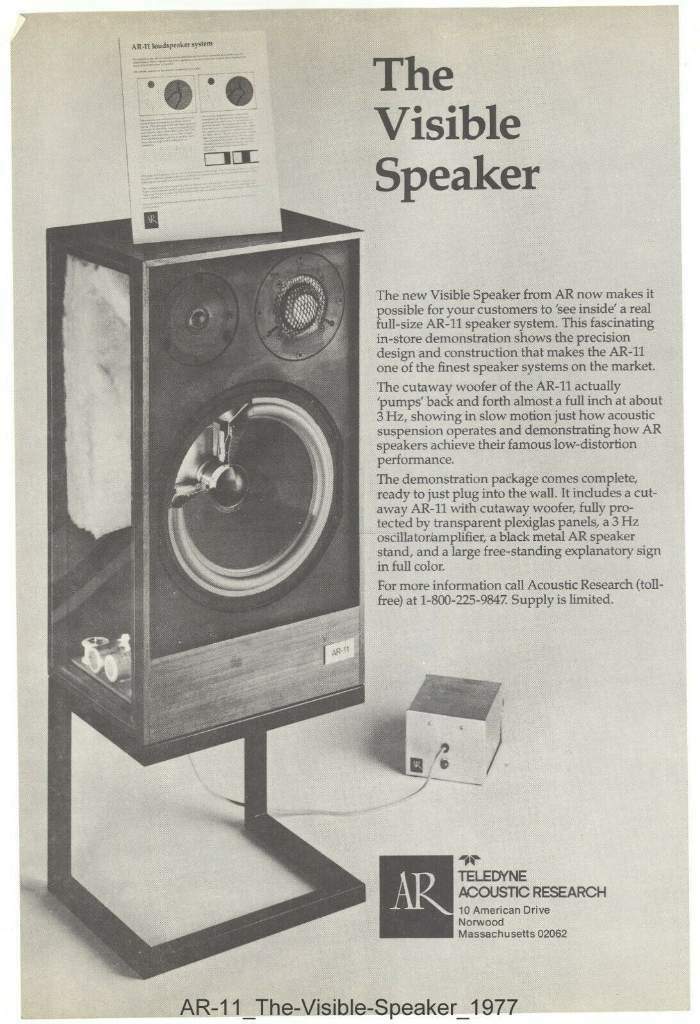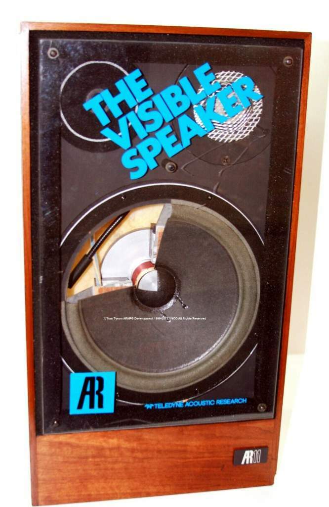 sopra "The Visible Speaker", un esemplare sezionato delle prime AR3a prodotte da Acoustic Research, ad illustrare la costruzione e particolarità del successore delle AR3a.