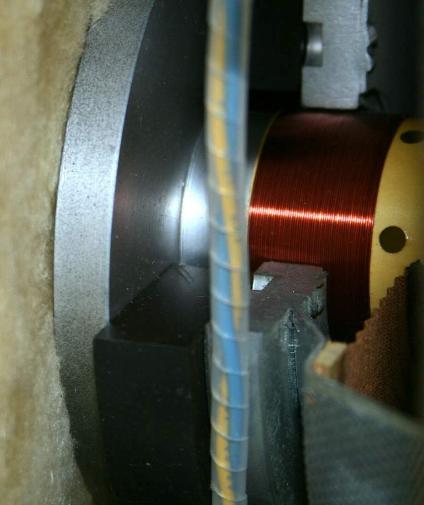 nella vista laterale del woofer si capisce bene i componenti assemblati di cui è composto, ma soprattutto il supporto della bobina, che se non ricordo male è in ottone, con i relativi fori per la ventilazione e raffreddamento della bobina stessa...