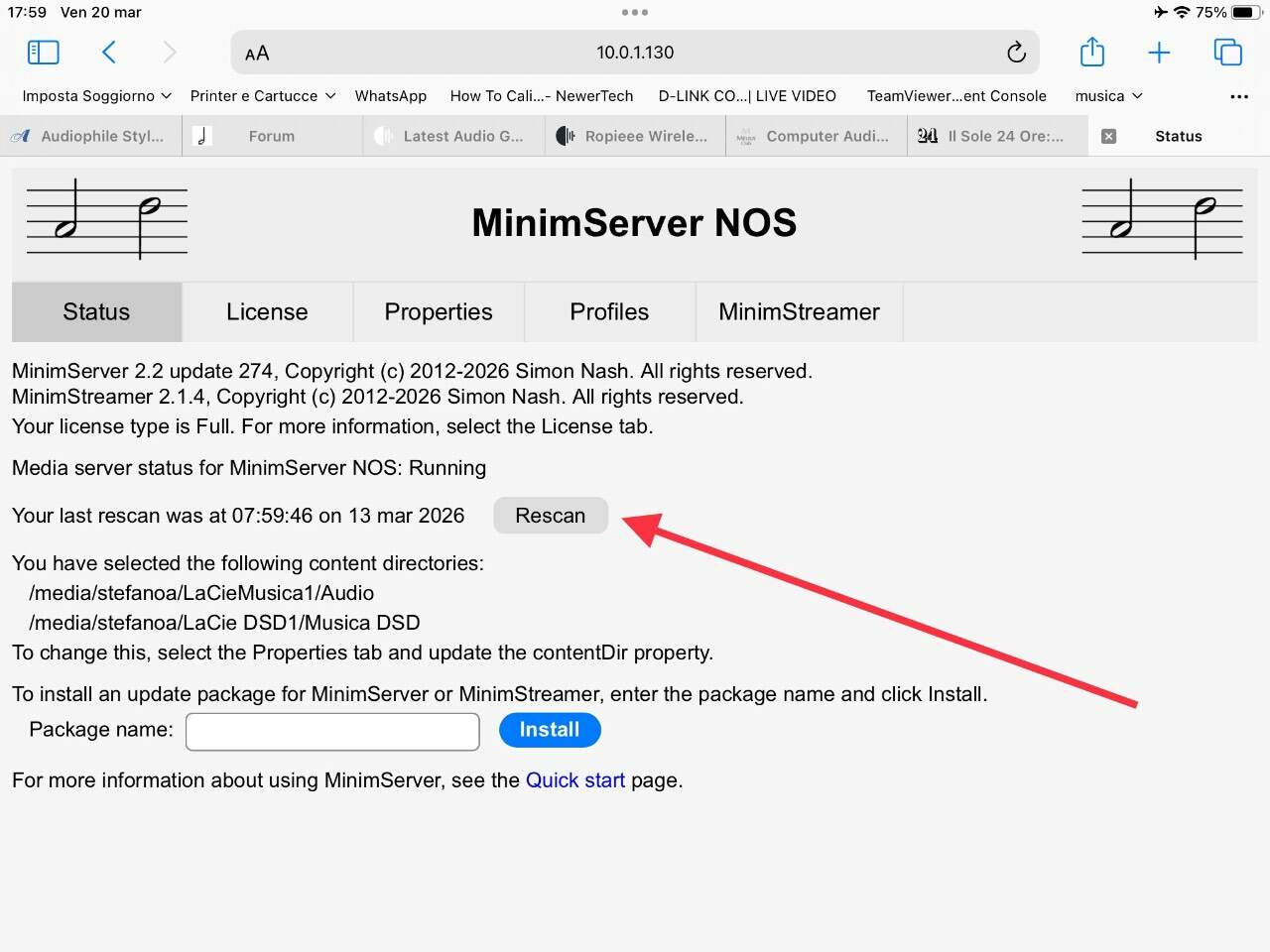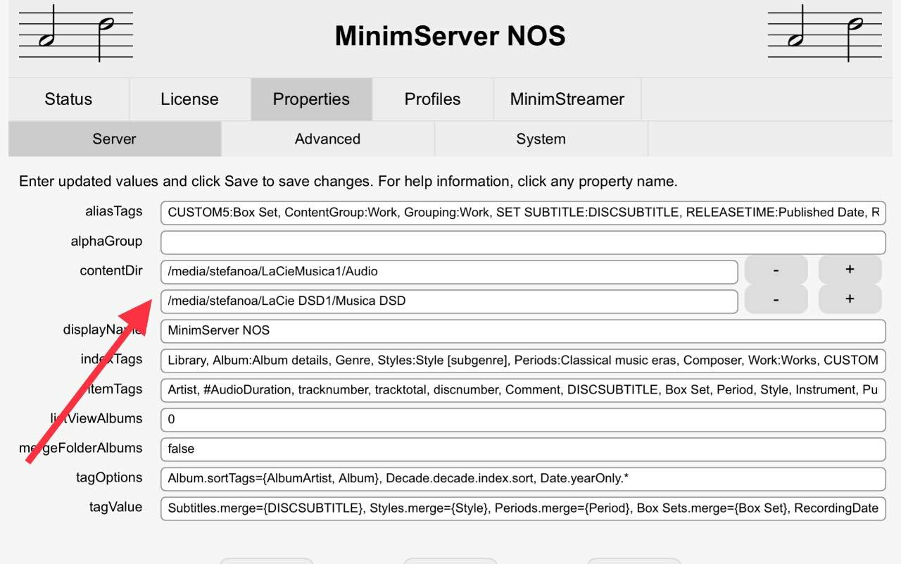 stefano_mbp Inviato 20 Marzo Autore Condividi Inviato 20 Marzo 23 minuti fa, CDJ ha scritto: Come faccio a cambiare una cartella dove ci sono i file audio, ovvero attualmente su Documenti Del pc mentre vorrei utilizzare un hard disk esterno? Apri nel browser la pagina di configurazione di Minimserver http://<indirizzo-pc>:9790 quindi vai nel tab Properties e imposta il nuovo percorso dell’archivio in contentDir, quindi clicca su Save e poi Restart . vai quindi nel tab Status e dovresti vedere l’indicazione Rescanning, se la scansione non fosse partita automaticamente clicca su Rescan . a seconda del control point app che utilizzi potrebbe essere necessario, una volta terminata la scansione di Minimserver, ricaricare la libreria sulla app (Lumïn, JPay for iOS), non dovrebbe servire se usi Bubbleupnp, MConnect Player, Linn poiché questa app non hanno un proprio db interno Link al commento https://melius.club/topic/118-minimserver-una-breve-guida-alla-configurazione/page/22/#findComment-1723157 Condividi su altri siti Altre opzioni di condivisione...