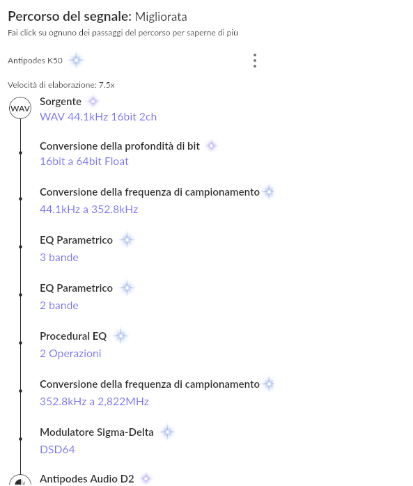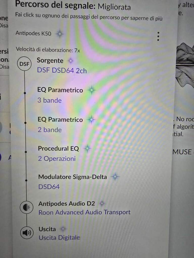 PippoAngel Inviato Martedì alle 16:13 Condividi Inviato Martedì alle 16:13 5 ore fa, PippoAngel ha scritto: @kimera se apri la stellina vedi il flusso dell'elaborazione che fa Roon ... Almeno Roon te lo dice !!! La fase chiamata "Modulatore Sigma-Delta" converte il PCM in DSD ... e Roon ti permette di impostarne alcuni parametri. Confesso che non avendo album DSD non conosco molto queste impostazioni ....so solo che ci sono !!! Link al commento https://melius.club/topic/11860-gustard-a26/page/25/#findComment-1690323 Condividi su altri siti Altre opzioni di condivisione...