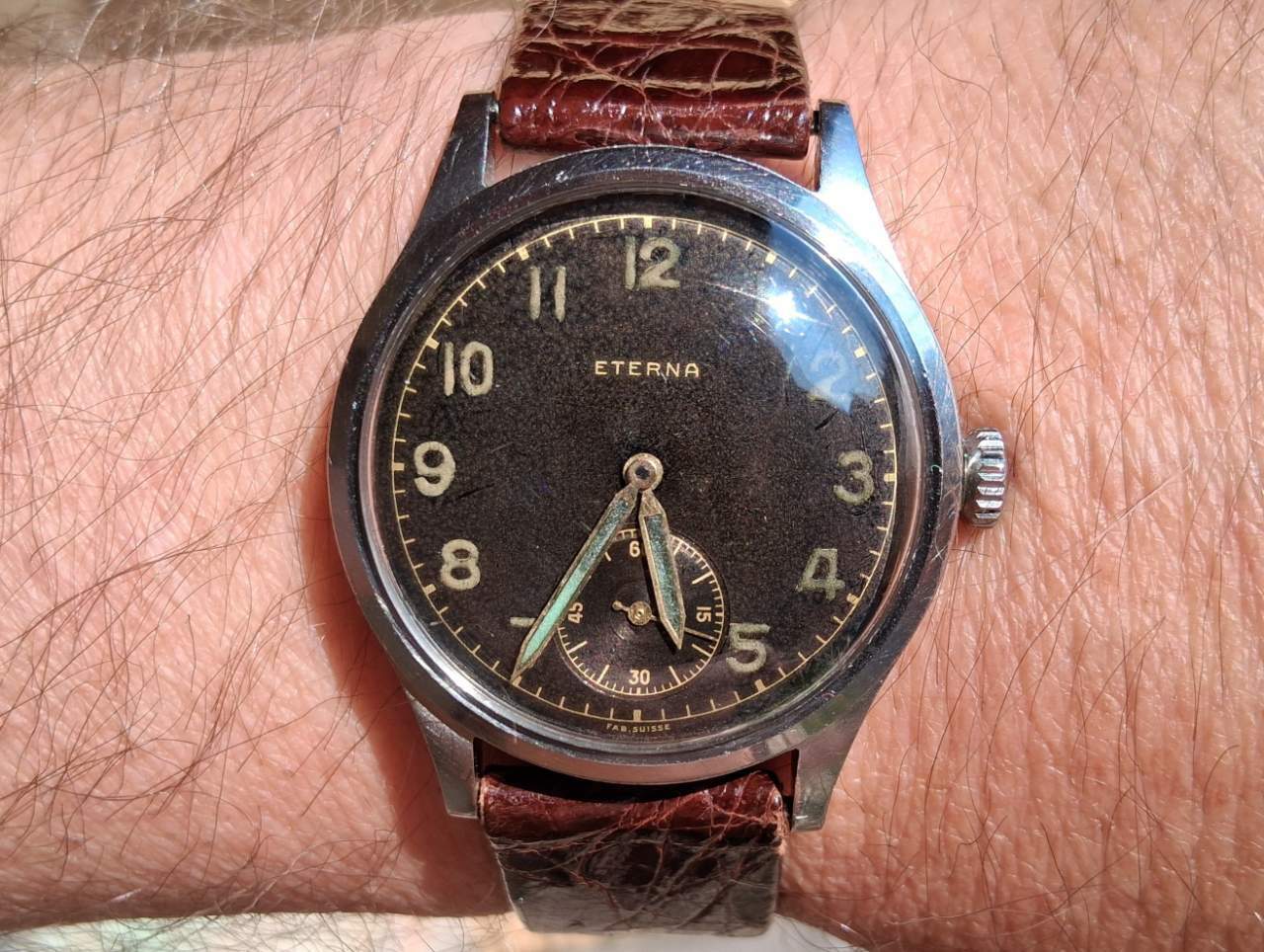 JureAR Inviato 15 Giugno Inviato 15 Giugno Come unire l' utile al dilettevole...Citizen Promaster con alternativa di cinturino Nato al posto dell' originale in gomma ...cinturino nuovo a costo zero, era abbinato all' ultimo acquisto, questo Eterna 852 orologio tanto cercato e finalmente ho aggiunto questo esemplare in collezione, tolto il Nato che ora è con il Citizen, lo ho abbinato ad un cinturino Eterna in coccodrillo... questo Eterna 852 era il "pezzo" mancante in collezione, tanto cercato e discriminato tra quelli osservati per l' anno di produzione, data circa 1942, provenienza tedesca e tipologia della cassa e quadrante, soddisfatto dell' acquisto, la sola vista del grande calibro è motivo di soddisfazione Infine il nuovo arrivat assieme a due contemporanei Eterna, al centro un calibro 520 del '44 assegnato alla Luftwaffe... ...e relativo fondello e bel calibro 520 2