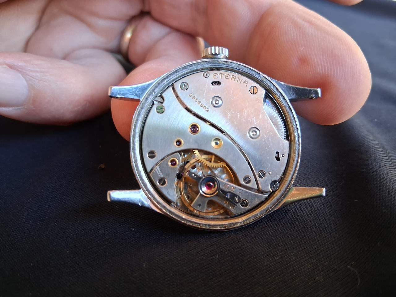 JureAR Inviato 15 Agosto Inviato 15 Agosto Il primo Eterna Matic da uomo, in foto un mio esemplare di forma del 1949, è nato poco prima il rotore bidirezionale montato su cuscinetto a 5 sfere, brevetto di Eterna, da allora il cuscinetto è stato adottato universalmente. Come molte innovazioni il rotore a cuscinetto nasceva per gli orologi da donna ( che con il classico rotore unidirezionale non garantivano una ricarica sufficiente), risolta appunto con l' introduzione del nuovo rotore, adottato poi universalmente in tutti gli Eterna Matic. Ed il calibro con il nuovo rotore ben rifiniti ed a forma di ancora 1