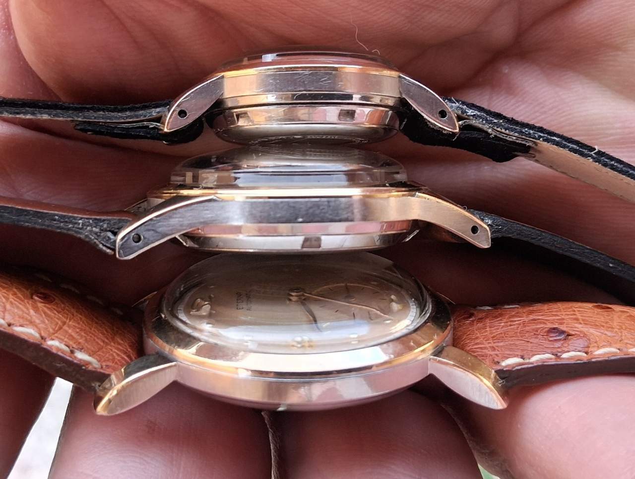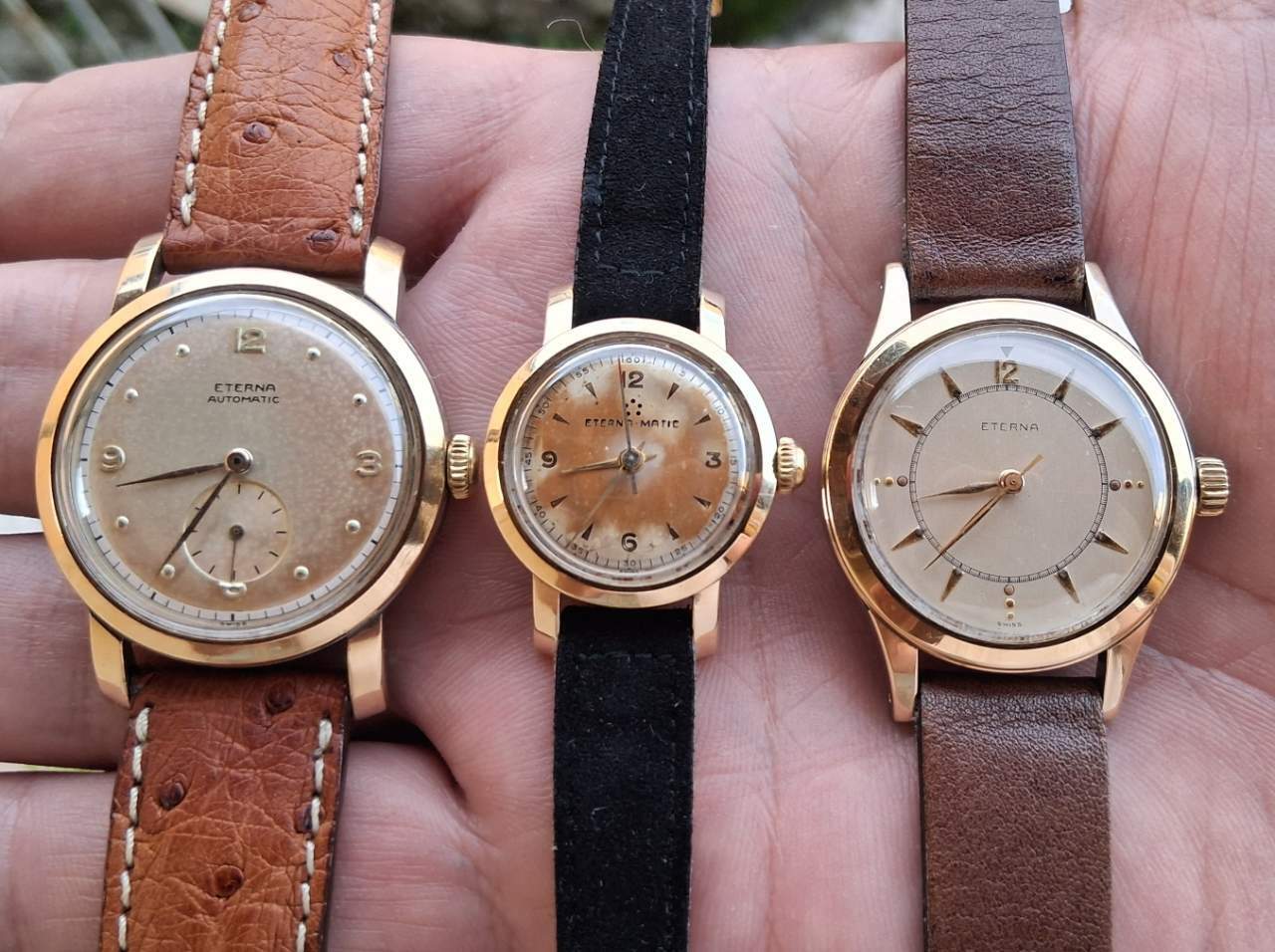 JureAR Inviato 25 Settembre Inviato 25 Settembre Accompagno con un Tavannes "famigliare", 35 mm. il diametro cassa, il calibro è Venus 165... ...aggiungo una terzina Eterna, con cassa in oro/acciaio, significativa della produzione Eterna: a sinistra Eterna Automatic bumper , 1946, al centro Eterna-Matic lady, 1949, a destra un calibro 520 manuale del 1950... Rimanendo in Eterna, tre post sopra ho inserito foto di un oversize...lo cercavo da tempo e mancava decisamente un calibro 852, rigorosamente a secondi diretti, e calibro spettacolare! 2