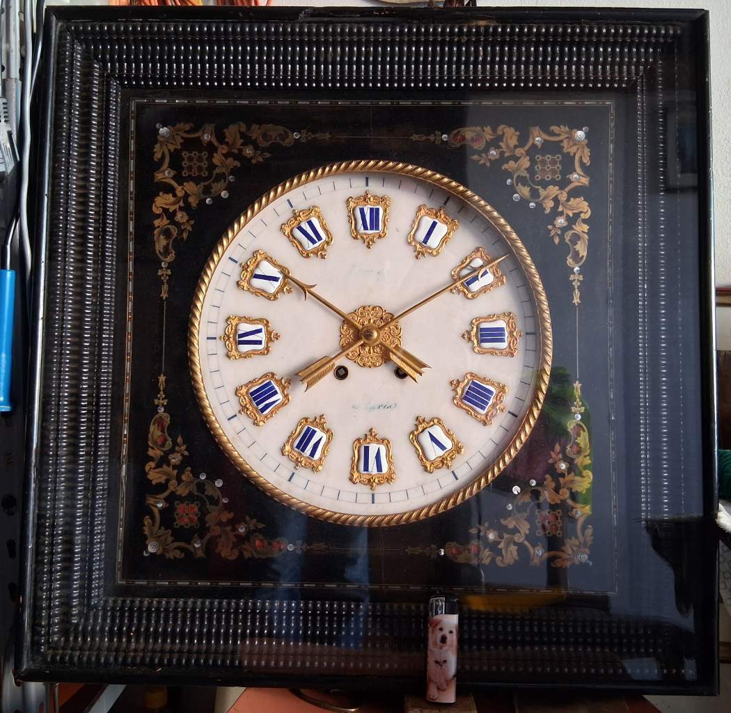 Fotografato ora in cantina dell' anziano genitore, non l' avevo mai visto prima, un orologio da parete: il mobile in legno è a forma quadrata di oltre  60 cm. a lato, il quadrante è decisamente bello in smalto ed indici in spessa porcellana, splendide le sfere dorate, a dimensionare e proporzionare il tutto, alla base un accendino di 8 cm. di altezza!