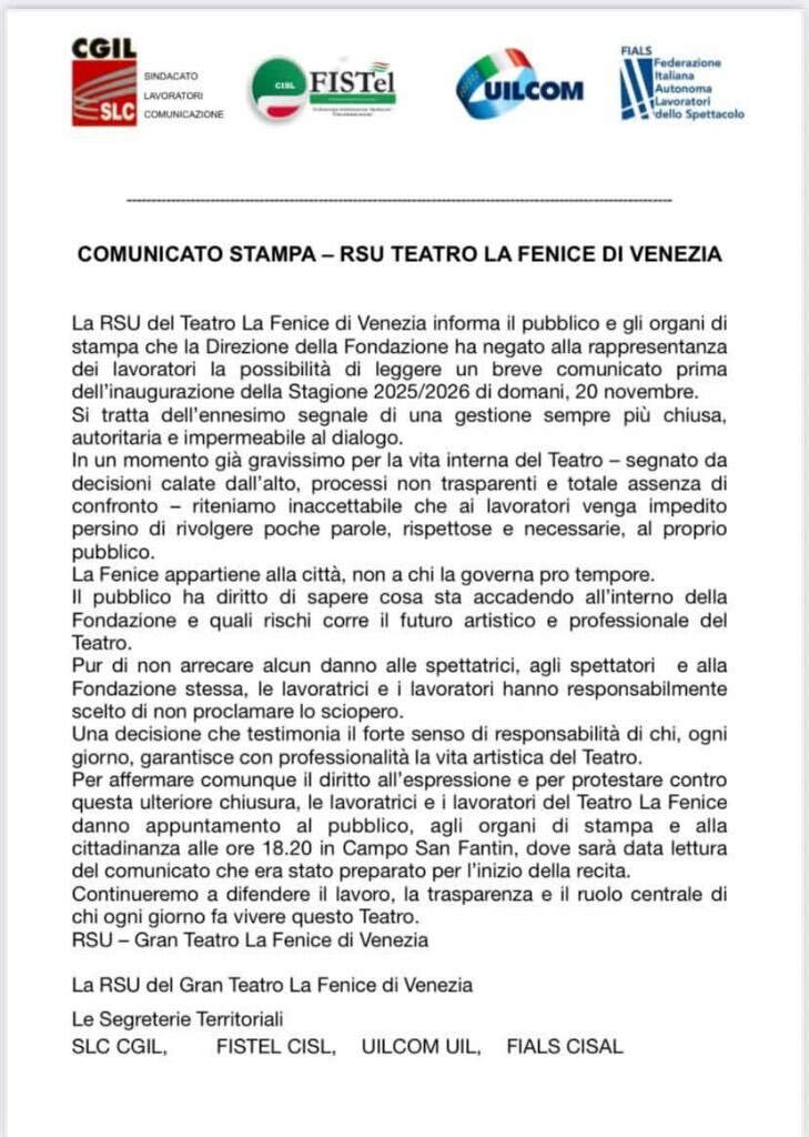 Lolparpit Inviato Venerdì alle 08:27 Inviato Venerdì alle 08:27 O Venezi, o morte! L'importante è dare un posto ben remunerato, di prestigio e visibilità, a questa grande 'direttore', costi quel che costi. Tutto il resto è noia. Il 17/11/2025 at 19:01, Grancolauro ha scritto: Che siano state inviate in battaglia le forze speciali della comunicazione di destra è significativo in tal senso: non molleranno il punto a nessun costo. Trovo questo atteggiamento intimidatorio e mi pare si voglia mandare un messaggio non troppo velato verso altri soggetti analoghi ai musicisti della Fenice e ai loro rappresentanze sindacali: non provate a contestare e ostacolare le nostre nomine, siamo disposti a farvi la guerra senza lesinare la nostra potenza di fuoco mediatica. Porro ce l'aveva con i sindacati che, a suo dire, 'non tutelavano' la direttrice, tapina, biondocrinita.