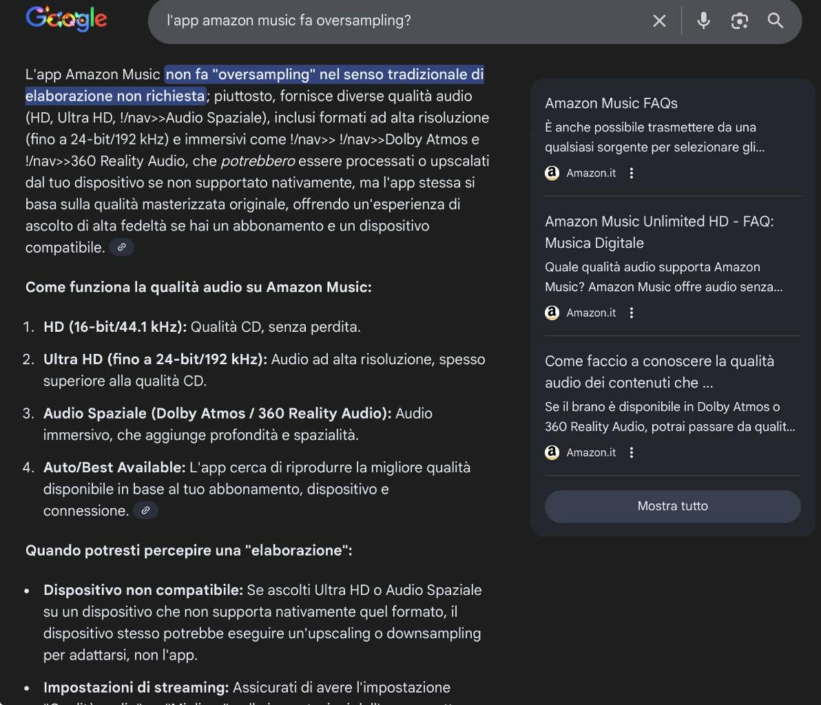 giuca70 Inviato Sabato alle 06:55 Autore Condividi Inviato Sabato alle 06:55 L'app di amazon music "purtroppo" non è bitperfect. L'unico hardware che accetta il bit perfect è il Wiim ultra con AHD. Mi è piaciuto molto con i suoi brani Atmos, pero' l'ho abbandonato perche' non gestisce il sincronismo col DAC esterno. AHD non ha mai fornito la API per dar modo ai programmatori dei vari palyer di interfacciarsi con l'hw. Se il tuo KA17 indica sempre 192 KHz vuol dire che l'hw dell'iPad pro lo setta al max 192, e quindi "se tutto va bene" avresti un sovracampionamento hw sempre a 192 KHz, non far caso a cosa dice AHD, lui vorrebbe che il file nativo fosse 24/96, ma è fuorviante il fatto che indichi "dispositivo esterno" quando dovrebbe indicare Fiio KA17. Link al commento https://melius.club/topic/18358-fiio-ka17-mini-desktop-amplifier-with-dac/page/9/#findComment-1652434 Condividi su altri siti Altre opzioni di condivisione...