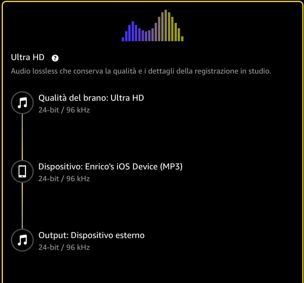 claravox Inviato Venerdì alle 22:56 Condividi Inviato Venerdì alle 22:56 Domanda da neofita, sto utilizzando da poche ore il Ka17 collegato con l’adattatore ad iPad Pro. Utilizzando l’app di Amazon Music il display del fiio indica PCM192K ad esempio ascoltando The Harmony Codex di Steven Wilson, ma l’app di Amazon mi dice come da screenshot, sbaglio qualcosa? Link al commento https://melius.club/topic/18358-fiio-ka17-mini-desktop-amplifier-with-dac/page/9/#findComment-1652383 Condividi su altri siti Altre opzioni di condivisione...