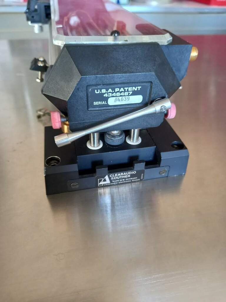 lucaz78 Inviato 20 Febbraio 2024 Inviato 20 Febbraio 2024 Credo possa rientrare in vintage, siamo negli anni 80 e Clearaudio acquista il brevetto Souther per questi bracci tangenziali,poi diventati uno dei loro cavalli di battaglia. Mi sono lasciato tentare non avendone mai provato uno, il prezzo era allettante sebbene avessi dubbi (ancora da sciogliere) sulle effettive condizioni di funzionamento. è totalmente meccanico, il piccolo carrello con tre cuscinetti scorre su due binari in quarzo, trasportato soltanto dalla testina che scorre nel solco. Sembra tenuto bene, le due grandi viti di regolazione VTA sono state rifatte artigianalmente in ottone pieno ma sembra un lavoro di ottima fattura, e svolgono lo stesso il loro compito. Un solo contrappeso presente per regolare la forza di appoggio, sufficiente a detta del venditore, ma eventualmente si potrebbe trovare un pesetto aggiuntivo senza difficoltà. Il "carrello" sembra scorrere bene nei due binari in quarzo, magari sarà necessaria una pulizia ma niente di che. Il cavetto è quello originale,molto flessibile e per il momento non intendo toccarlo. Ho una armboard "vuota" per il TD124 sulla quale vorrei montarlo, devo prima verificare le misure e la compatibilità delle 3 viti di fissaggio in modo che non vadano a toccare lo chassis in alluminio. Avete esperienza con questi bracci? qualche dritta sul montaggio e su quale testina abbinarci? Pensavo di provare con la Shure M75 ED T2, alta cedevolezza, ma sono aperto a suggerimenti.
