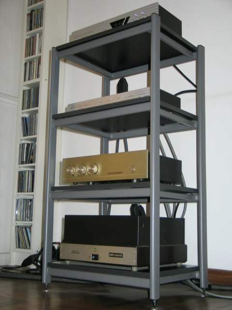 antonio_caponetto Inviato 29 Marzo 2024 Inviato 29 Marzo 2024 Chiedo un aiuto agli amici forumer, sperando che qualcuno mi sappia illuminare. Posseggo un vecchio tavolino hifi della GM Audio. Già comperato usato all'epoca, impossibile per me trovare manuale o scheda tecnica. Vorrei capire qual è la capacità di peso dei ripiani. Non ho mai avuto problemi di avere elettroniche pesanti e quindi mai mi sono posto in precedenza il problema. Adesso sto accarezzando l'idea di una elettronica con alimentazione separata: si tratta di 10 + 26 kili. A naso i 26 kili non credo che non sarebbero sopportati ma poichè ho problemi di spazio sto prendendo anche in considerazione l'idea di impilarle. Sempre ammesso e concesso che ciò non sia sonicamente una bestemmia, vorrei capire se meccanicamente il tavolino reggerebbe. Ho questa foto. I ripiani sono in mdf per quanto posso capire e poggiano su 3 piccoli coni: questi potrei anche toglierli facendo poggiare i ripiani in mdf direttamente sulla intelaiatura in metallo.