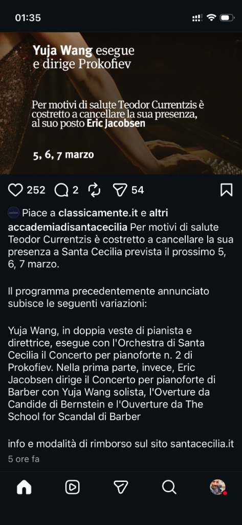 moos Inviato 28 Febbraio Condividi Inviato 28 Febbraio 13 ore fa, garmax1 ha scritto: @analogico_09 altra notizia che ti potrà interessare, il maestro Currentzis ha annullato i suoi 3 concerti a Santa Cecilia con orchestra dell'accademia per indisposizione... Ed io che vengo da Varese per quel concerto..... treno, hotel e biglietti già presi da tempo.... Spero ne valga comunque la pena... Link al commento https://melius.club/topic/20534-concerti-di-musica-classica-stagioni-date-e-impressioni/page/42/#findComment-1707992 Condividi su altri siti Altre opzioni di condivisione...