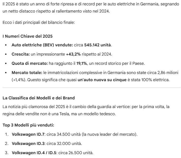 criMan Inviato 20 Gennaio Autore Condividi Inviato 20 Gennaio 15 ore fa, Amedeo.R. ha scritto: I dati ufficiali sono forniti direttamente dall'autorità tedesca per i veicoli a motore, le Golf immatricolate nel 2025 sono state 85mila...le ID3 sono 31mila... La Golf è stata l'auto più venduta in Germania, nelle prime 10 posizioni di auto più vendute non figura ne la ID3 ne la ID7. e' sempre interessante notare quanto siano inaffidabili le risposte di AI overview. Ho ripreso i dati della Golf richiedendo il numero di immatricolazioni nel mercato interno nel 2025 e mi ha risposto sempre intorno alle 100.000 unita'. Salvo poi io andare a verificare le fonti e il dato e' corretto ma del 2024. Certo non cambia il succo della situazione ma ci da un idea dell'affidabilita' dei numeri prodotti da queste ricerche. 1 Link al commento https://melius.club/topic/22314-auto-elettriche-la-transizione-vantaggi-svantaggi-criticit%C3%A0-perplessit%C3%A0/page/43/#findComment-1680325 Condividi su altri siti Altre opzioni di condivisione...