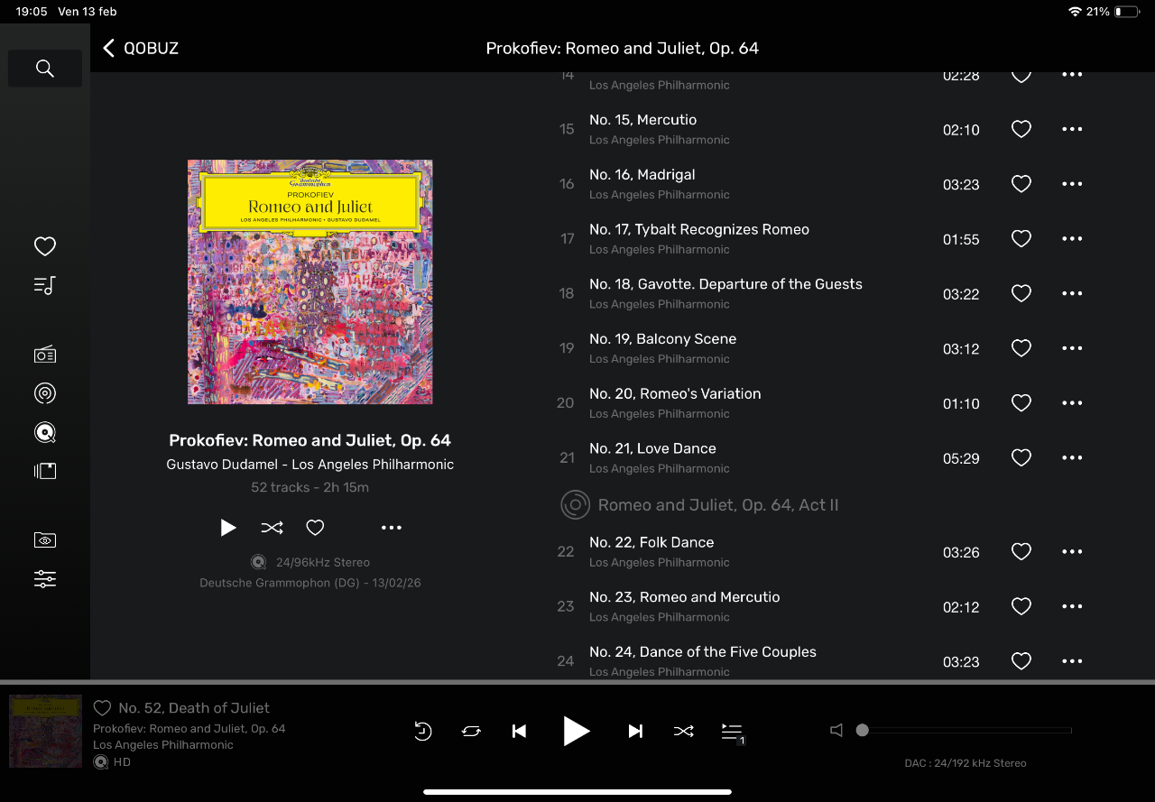 SimoTocca Inviato 13 Febbraio Autore Condividi Inviato 13 Febbraio E concludo questa rassegna di oggi con un album che ho atteso fin dal suo annuncio da parte della DG: Il Romeo e Giuletta di Prokofiev nella sua versione integrale. L'ascolto della prima parte mi ha sedotto: del resto anche Dudamel, come detto a proposito di Gimeno, ha dalla sua, un senso del ritmo fenomenale. E questo balletto di ritmo ne ha molto. Con domani concluderò l’ascolto…. E magari si potrà commentare meglio insieme a qualcuno di voi… ma già adesso posso dire che, proprio come per lo Schiaccianoci integrale di Tchaikovsky, questo album di Dudamel diventerà uno dei miei due/tre riferimenti primpncipali (anche contando le Suites, le versioni parziali cioè, che includo nomi come Abbado, Gergiev, Muti…& Co). 1 Link al commento https://melius.club/topic/234-le-nuove-uscite-di-classica-e-di-lirica-in-hires/page/60/#findComment-1697464 Condividi su altri siti Altre opzioni di condivisione...