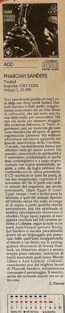 Questo è un messaggio popolare. campaz Inviato 10 Gennaio 2023 Questo è un messaggio popolare. Condividi Inviato 10 Gennaio 2023 Un’altra recensione se non negativa almeno non entusiasta da un vecchio Audio Review. E ancora una volta non mi ritrovo con quel giudizio. Qui siamo dalle parti dei discepoli di Coltrane, il periodo è quello più sperimentale. Il free non è il mio jazz preferito, eppure la delicatezza, la sinergia assoluta, la forza e la freschezza di questo disco ne fanno un ascolto tanto piacevole quanto intelligente (insomma: non ti annoi e nemmeno ti viene mai da domandarti se i musicisti non si siano spinti un po’ troppo in là). Solo tre pezzi, il primo (Upper Egypt and Lower Egypt) una spanna sopra gli altri, un chitarrista (Sonny Sharrock) e un percussionista (Nat Bettis) da dieci e lode. 3 1 Link al commento https://melius.club/topic/24-cosa-state-ascoltando/page/940/#findComment-699835 Condividi su altri siti Altre opzioni di condivisione...