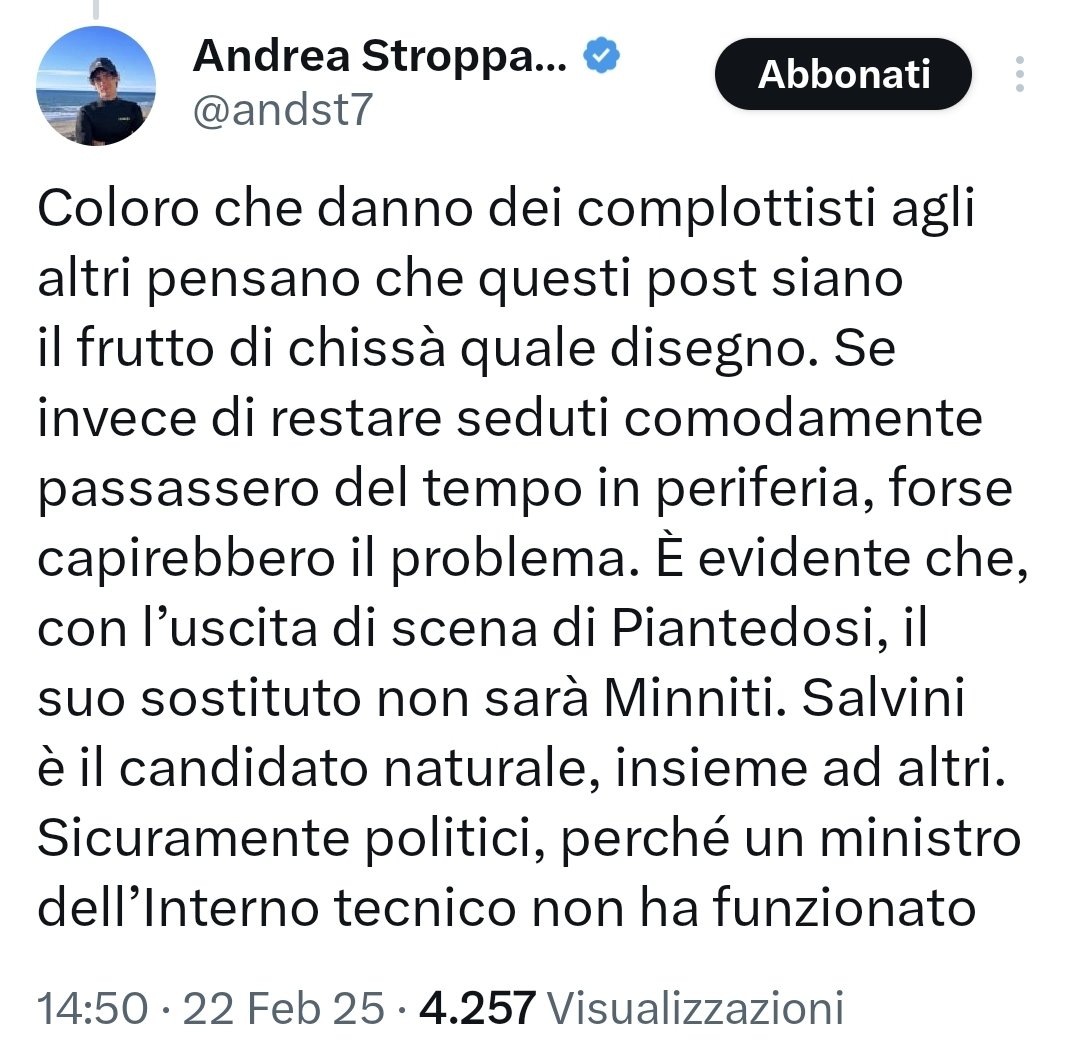Velvet Inviato 23 Febbraio Inviato 23 Febbraio 3 minuti fa, appecundria ha scritto: Salvini passa all'incasso. Il progetto ora appare più chiaro. Si consolida l'asse putin-musk+trump-sovranisti e nazi europei condito con salsa novax. Andrà tutto bene
