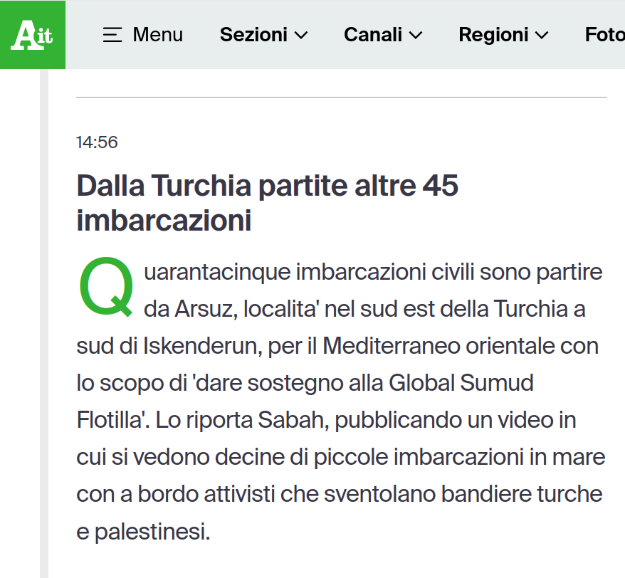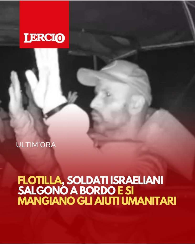 Plot Inviato 7 ore fa Inviato 7 ore fa ...comunque sia, ai detrattori dell' operazione Flotilla sarebbe consigliabile mettersi l' anima in pace. Ne vedremo delle belle. Ansa: - - https://www.ansa.it/sito/notizie/mondo/2025/10/02/media-israele-abbordate-40-su-47-barche-della-flotilla.-attivisti-due-barche-verso_633414f9-a3f2-495b-906b-2228e0248e03.html