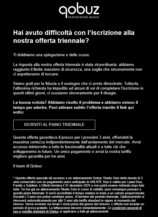 pl_svn Inviato 9 Settembre Inviato 9 Settembre uso Qobuz dal 2015 e sono abbonato dal 2016 (prima che fosse disponibile ufficialmente in Itaglia) e... non se lo ricorda nessuno che, fino al 2020, l'abbonamento Studio (o equivalente) costava 249€/anno? non che mi renda felice un (possibile?) aumento ma... dai...! quanto alla mail, che ho ricevuto anche io, penso abbia ragione max