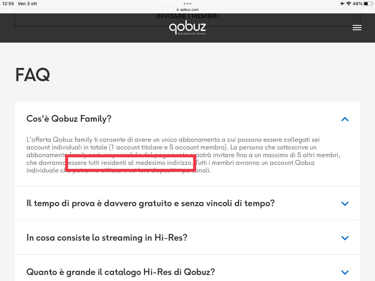 stefano_mbp Inviato 3 Ottobre Inviato 3 Ottobre 7 minuti fa, Ultima Legione @ ha scritto: QOBUZ vincola la possibilità che i sei diversi Account debbano comunque operare nell'ambito della medesima rete … solo teoricamente … e comunque si parla di “medesimo indirizzo di residenza” e non di “medesima rete”, differenza non da poco … pensa al condominio: stesso indirizzo, reti diverse … e quando ti abboni non è richiesto alcun indirizzo …