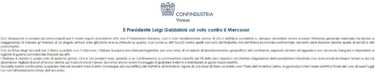 maurodg65 Inviato Sabato alle 11:54 Condividi Inviato Sabato alle 11:54 Confindustria Varese il comunicato: Con disappunto e sempre più preoccupati per il nostro export prendiamo atto che il Parlamento Europeo, con il voto fondamentale anche di chi si definisce sovranista e, dunque, dovrebbe avere a cuore l'interesse generale nazionale, ha deciso maggioranza di tutelare gli interessi di un singolo settore (che già tanto aveva ottenuto su questo, così come su altri tavoli) contro quelli, non solo dell'industria, ma dell'intera economia continentale, del resto delle imprese (anche quelle di servizi) e de consumatori. Con la firma degli accordi per il libero scambio con il Mercosur, l'Unione Europea era stata protagonista, per una volta, di un'azione di riposizionamento geopolitico del continente, sapendo dettare un'agenda e non dovendo inseguire e rispondere con logiche di guerra commerciale imposte da altri. L'illusione è durata lo spazio solo di qualche giorno. Ora e nei prossimi mesi, quando e se continueremo a commentare crescite del Pil dello zero virgola o un'ulteriore stagnazione della produzione industriale che dura ormai da troppo tempo e da cui dipendono migliaia di posti di lavoro, anche qui in provincia di Varese, dovremo anche avere il coraggio di guardarci indietro e individuare le giuste responsabilità. Da parte nostra continuiamo a sperare che nei prossimi mesi si arrivi comunque ad una ratifica dei trattati e all'entrata in vigore di una zona di libero scambio con i Paesi dell'America Latina. Augurandoci che il reale obiettivo 1 Link al commento https://melius.club/topic/26404-accordo-mercosur-la-ue-fa-solo-danni/page/8/#findComment-1682590 Condividi su altri siti Altre opzioni di condivisione...