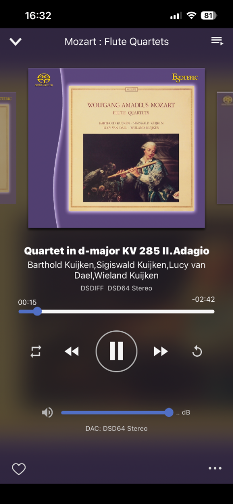 rossano92 Inviato 28 Gennaio Condividi Inviato 28 Gennaio Etichetta Accent. Doppio microfono, pochissima post produzione. Flusso DSD64 SACD Esoteric. Si sente il riverbero della sala, flauto leggermente a sinistra. Sto ascoltando da una Beyer T1 mk2, Teac HA-507 in cascata a un Teac VRDS 701. Generatore di clock esterno Teac CG-10MX. Il suono galleggia nella testa per quanto è coerente e pulito. 1 Link al commento https://melius.club/topic/27-cosa-state-ascoltando-in-questo-momento-in-cuffia/page/1202/#findComment-1685826 Condividi su altri siti Altre opzioni di condivisione...