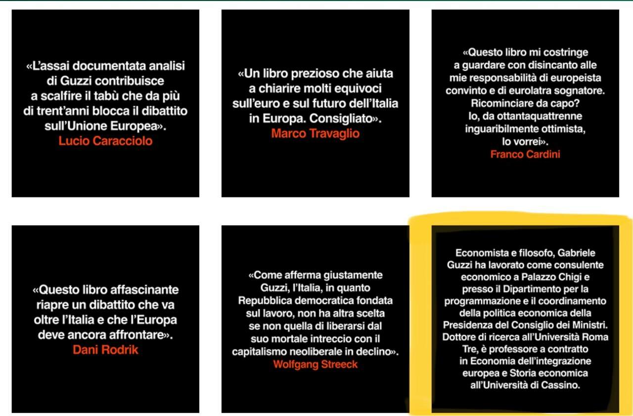 criMan Inviato 3 Dicembre Condividi Inviato 3 Dicembre 1 ora fa, claravox ha scritto: Ritenta sarai più fortunato. perdonami il tizio non e' solo "filosofo" ! , ho visto che tiene comizietti parlando di filosofia pensavo avesse una laurea in filosofia leggo adesso invece che ha anche laurea in economia . E questo fa ancora piu' male perche' se tu risenti il primo video che hai postato il tizio ha fatto solo "politica" non ha parlato di "economia". Nel senso che quello che dice e' molto orientato politicamente e poco attinente all'economia. Come avesse parlato chesso' il salvini della situazione. Siamo ad un livello al pari di quello che scriveva Savgal sopra , stampiamo moneta e siamo tutti felici. Non conosco le sue idee politiche e ne conosco comizi fatti in materia di economia... ma fidati che nei primi 10 minuti del primo video che hai postato su questo signore che ha collezionato parecchi sfondoni e non sto' scherzando. Se vuoi ne parliamo , se no lasciamo correre. Secondo me e' molto bravo a ritagliarsi uno spazio tra i media e infatti e' molto apprezzato. PS : il padre e' uno forte molto in gamba. Link al commento https://melius.club/topic/27520-un-piano-per-smantellare-la-ue/page/13/#findComment-1646019 Condividi su altri siti Altre opzioni di condivisione...