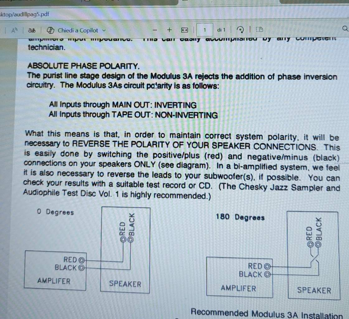 ilmisuratore Inviato 7 Dicembre Condividi Inviato 7 Dicembre 1 ora fa, ascoltoebasta ha scritto: Innanzitutto grazie per la risposta,le mie Opera V sono del 2013,escludo la suggestione in quanto quando mi è sembrato che il suono non fosse "completo" (è difficile spiegare la sensazione) ero ignaro del fatto che il PF-R fosse a fase invertente,controllai attentamente tutte le connessioni perchè qualcosa non mi tornava,pensai che forse la sinergia non era ottimale e solo dopo aver recuperato in rete il manuale ho invertito i cavi di potenza e il suono si è "completato" in modo udibile,specialmente nei bassi,ora il risultato è davvero soddisfacente e superiore alle aspettative data la spesa irrisoria e la vetustà del pre e dei finali. ...come anticipato da @scroodge...sarà "completo" con il 50% delle registrazioni e "incompleto" con il restante Link al commento https://melius.club/topic/27588-la-fase-assoluta-e-la-sua-percezione-allascolto/page/2/#findComment-1648736 Condividi su altri siti Altre opzioni di condivisione...
