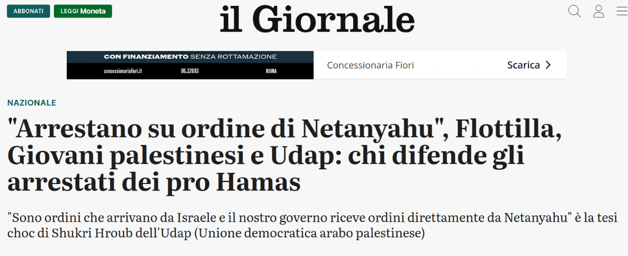 Plot Inviato Sabato alle 23:32 Condividi Inviato Sabato alle 23:32 - "Chi supporta i palestinesi sotto attacco diventa target dei fascisti, sono ordini che arrivano da Israele e il nostro governo riceve ordini direttamente da Netanyahu". Questa la tesi di Shukri Hroub dell'Udap (Unione democratica arabo palestinese), responsabile logistica della Freedom Flotilla secondo cui gli arresti di oggi "si commentano da soli, come le denunce e gli abusi di ogni tipo". Il Giornale https://www.ilgiornale.it/news/nazionale/flottilla-giovani-palestinesi-e-udap-ecco-chi-difende-2588417.html Link al commento https://melius.club/topic/27809-terrorismo-7-milioni-di-euro-ad-hamas-da-tre-societ%C3%A0-di-beneficenza-nove-arresti-a-genova/page/5/#findComment-1662461 Condividi su altri siti Altre opzioni di condivisione...
