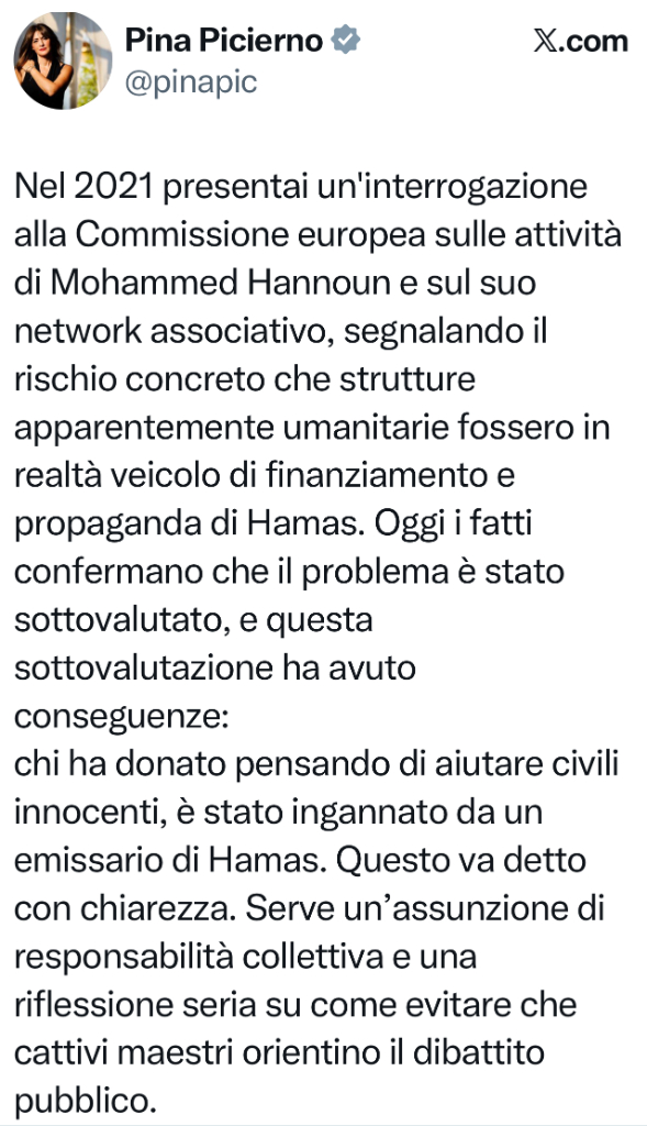 Roberto M Inviato 30 Dicembre 2025 Condividi Inviato 30 Dicembre 2025 18 minuti fa, appecundria ha scritto: Vivi in una realtà tutta tua. La sinistra è solo Avs, 5 Stelle e i PD area Schlein ? Quello che ci dice @robem e’ che (per fortuna, aggiungo io) a sinistra su questo tema c’è una grossa divisione. Guarda cosa scrive Ivan Scalfarotto, Italia Viva, Campo Largo. Pure lui vittima di una querela temeraria di Hannoun (querela archiviata) perché aveva scritto che Hannoun era il punto di riferimento di Hamas. Tempo addietro il signor #Hannoun mi querelò per aver definito pubblicamente la sua associazione un punto di riferimento di #Hamas in Italia, composta da simpatizzanti di un’organizzazione terroristica e antisemita. La querela fu archiviata dal GIP su richiesta del PM. Se gli investigatori hanno ragione, non ero stato completo: Hannoun non era solo un simpatizzante ma anche un finanziatore di Hamas, con soldi sottratti alla beneficenza destinata al popolo palestinese. Hamas usa due volte il suo popolo: trasforma i civili in scudi umani e ruba i fondi che dovrebbero dargli speranza. Questa è la verità che si voleva nascondere dietro querele e intimidazioni. Non ha funzionato. Link al commento https://melius.club/topic/27840-incoerenze-nel-pd/#findComment-1663815 Condividi su altri siti Altre opzioni di condivisione...