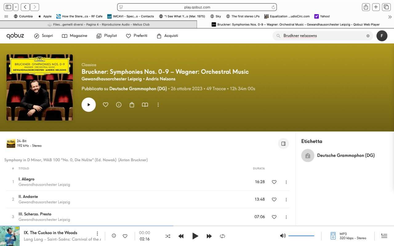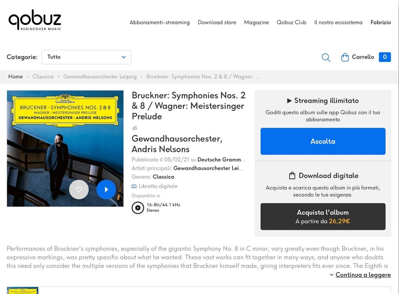 fabrizio Inviato 2 Gennaio Autore Condividi Inviato 2 Gennaio Salve, altra giornata passata a mettere a punto un sistema (veramente un bel sistema ) e verifica finale per valutare se sono udibili le differenze nei files qui oggetto di discussione . Prova superata , il titolare ha colto perfettamente le differenze . Vi propongo altri files : Bruckner Symphonies n.2 e 8 Gewandhausorchester Leipzig Andris Nelsons (sono uscite tutte le sinfonie prima in album singoli in versione HR 24/96 Ora è uscita l'integrale in unica soluzione sempre formato HR 24/96 Per semplificare provate ad ascoltare la traccia con l'Andante della N.2 Facendo la ricerca sulle tracce , la trovate sull'album singolo, sull'integrale ed anche in album singolo in formato 16/44 Provate ad ascoltate prima il file dell'Andante della N.2 del singolo HR , poi di seguito lo stesso file contenuto nell'integrale e quello in formato 16/44. Basta un paio di minuti , basta ascoltare l'incedere dell'orchestra , il senso di aria ed apertura nelle seconde due rispetto alla prima . A disposizione di chi si offre volontario per una dimostrazione . Saluti, Fabrizio 1 Link al commento https://melius.club/topic/27856-files-gemelli-diversi/page/5/#findComment-1666361 Condividi su altri siti Altre opzioni di condivisione...