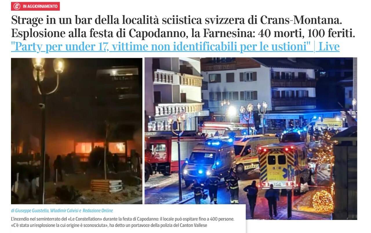 Questo è un messaggio popolare. Jack Inviato 1 Gennaio Questo è un messaggio popolare. Condividi Inviato 1 Gennaio Il Ristorante dove lavorano mia figlia ed il suo fidanzato è a 50 metri. Sono passati di lì 10 minuti prima andando a casa dopo il servizio di Capodanno. Tanti ragazzi molto giovani, una tragedia nella tragedia. A volte la tragedia ti passa tanto vicino. Non sembra doloso, pare che un incendio abbia causato l’esplosione, non viceversa. Un pensiero per le vittime e le loro famiglie 8 5 Link al commento https://melius.club/topic/27874-tragedia-a-crans-montana-sono-ancora-scosso/ Condividi su altri siti Altre opzioni di condivisione...