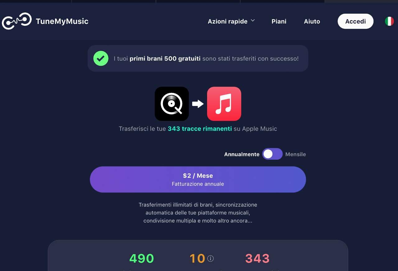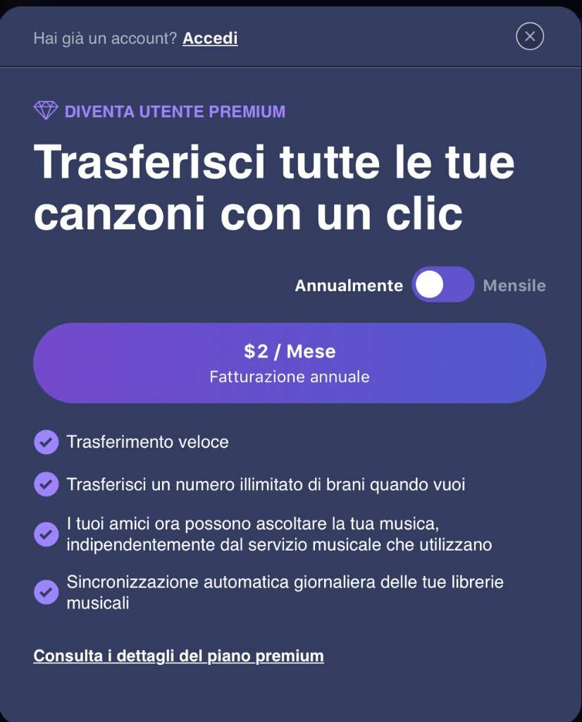 claravox Inviato 17 Gennaio Condividi Inviato 17 Gennaio @one4seven Lo ha fatto, con il limite dei 500 brani. Bisogna passare a premium per avere il trasferimento completo, per carità sono due dollari al mese ma solo per dare una informazione completa. 1 Link al commento https://melius.club/topic/27938-non-inorridite-ma-spiegatemi/page/2/#findComment-1678200 Condividi su altri siti Altre opzioni di condivisione...