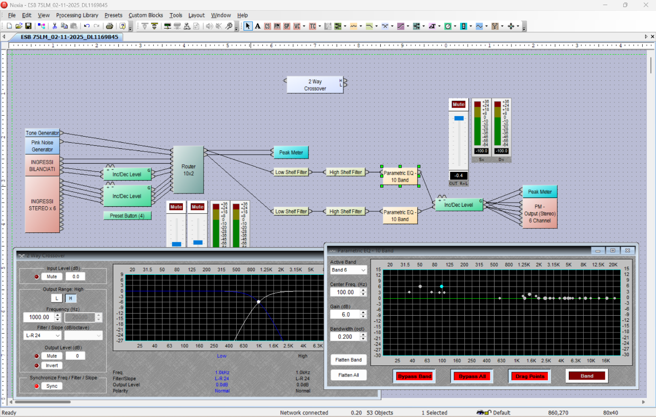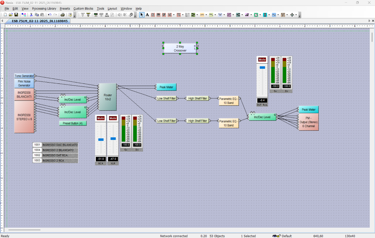 maxgazebo Inviato 17 Gennaio Condividi Inviato 17 Gennaio 4 ore fa, ferroattivo ha scritto: @maxgazebo interessante la tua segnalazione del Nexia PM . Uso il mio impianto multiamplificato a 4 vie con 4 finali con un Xilica XP4080. In teoria come si comporterebbe un Nexia PM rispetto al mio Xilica ? Onestamente non saprei come si comporterebbe, non conosco il 4080, ma ho visto che e' processore con architettura fissa, mentre i NEXIA sono architettura aperta, quindi lo "schema" del processamento a te necessario lo costruisci ad hoc, prendendo i moduli specifici (xover, eq, delay, router ingressi, vu meter, etc...) e li trascini nell-area di alvoro, poi col mouse colleghi uscite con ingressi con dei fili virtuali e completi lo schema, dove poi alla fine con un tasto lo "compili" in modo che il SW controlla il lavoro e ti avvisa se tutto OK o di qualche problema da correggere Poi lo scarichi dentro il Nexia....et voila' Puoi mettere in cascata due parametrici da 10 bande ognuno...20 bande di parametrico sul singolo canale...p.e. Questo lo schemino che sto usando io adesso, solo controlli EQ per linearizzare risposta in ambiente, e selezione ingressi 1 1 Link al commento https://melius.club/topic/28019-dsp-filtri-digitali-e-sta-roba/page/3/#findComment-1678105 Condividi su altri siti Altre opzioni di condivisione...