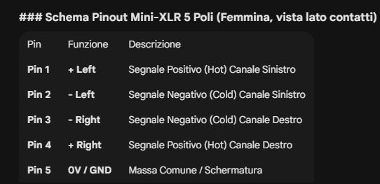 MauJazz Inviato 18 Gennaio Autore Condividi Inviato 18 Gennaio La massa sembra avere un collegamento indipendente che si può mantenere collegando il cavetto di massa e poi viene gestito in un pin separato nel mini xlr secondo questo schema: Ho capito bene? Link al commento https://melius.club/topic/28034-ingresso-bilanciato-uscite-sbilanciate/page/2/#findComment-1679078 Condividi su altri siti Altre opzioni di condivisione...