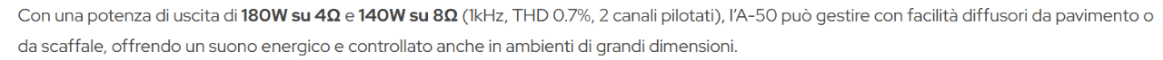 - manuale di istruzioni del prodotto : 110W rms per canale su 4 ohm, entrambe i canali pilotati ma con 1% di distorsione ( i dati precedenti si riferiscono allo 0,7% di distorsione ).