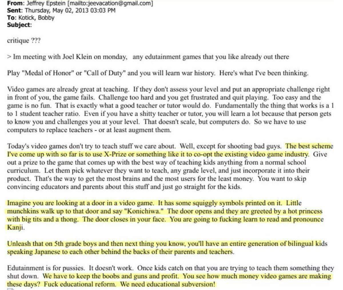 claravox Inviato Sabato alle 11:38 Condividi Inviato Sabato alle 11:38 Da queste email sta venendo fuori un ritratto a tutto tondo della Superclasse... Non è più questione di responsabilità penali, si va molto oltre ….. Nei messaggi e-mail del 2013, il banchiere Epstein e Bobby Kotick (CEO di Activision Blizzard, la società che ha creato Call of Duty, World of Warcraft, Candy Crush, Diablo, Overwatch) si chiedevano: "Come insegnare ai bambini a spendere soldi per il resto della loro vita?" Risposta: Bisogna costringerli a fare microtransazioni in Call of Duty. Premi allettanti, armi, oggetti virtuali. Perché "l'educazione attraverso i giochi è per i perdenti", è necessario abituare i bambini a pagamenti costanti. 1 Link al commento https://melius.club/topic/28247-la-faccenda-epstein/page/7/#findComment-1697761 Condividi su altri siti Altre opzioni di condivisione...