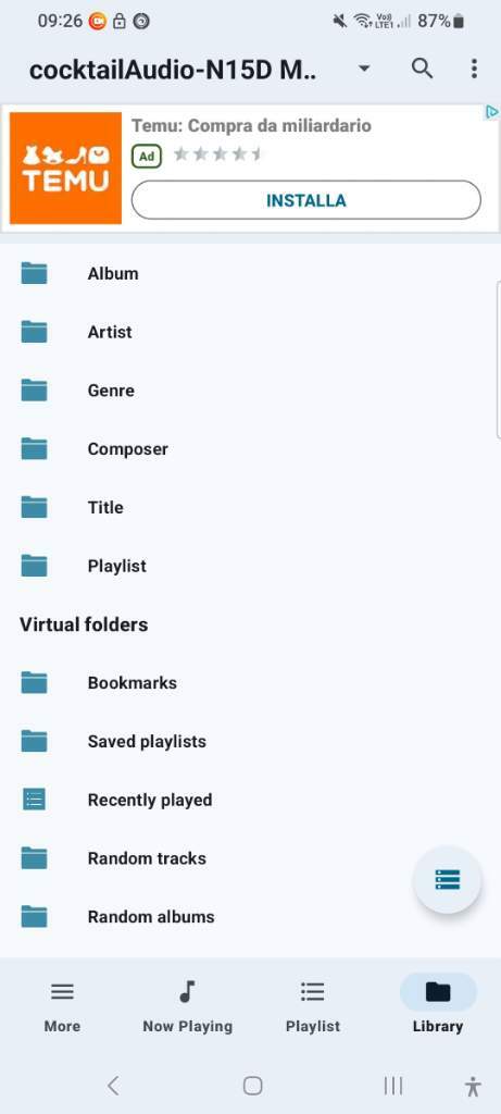 gianlucat73 Inviato 3 Febbraio Condividi Inviato 3 Febbraio Buonasera a tutti voi , è da molto che non scrivo qualcosa e oggi, avendo un po' di tempo a disposizione,ho voluto fare una prova l'app in oggetto ma non ne sono rimasto molto soddisfatto, ovviamente vorrei capire se per colpa mia... quindi, bubbleupnp versione gratuita installato sul telefono e cocktail audio come sorgente,i due si vedono benissimo e comunicano senza problemi,le canzoni vanno benissimo e perciò fino a qui tutto ok,ma 2 cose che non mi sono piaciute o che semplicemente non ho saputo settare... innanzitutto la vista artista/album , non mi fa vedere gli album quando clicco su artista ma mi mette direttamente le canzoni , il secondo problema è la lentezza nel caricare la libreria, ogni volta che spengo e poi riaccendo sembra che deve ricaricare tutto di nuovo... probabilmente è normale,non lo so,ma di certo è un po' frustrante... qualche aiuto da parte vostra? Potrebbe dipendere dalla versione gratuita? Grazie a chi vorrà intervenire Link al commento https://melius.club/topic/28299-bubbleupnp-lento/ Condividi su altri siti Altre opzioni di condivisione...