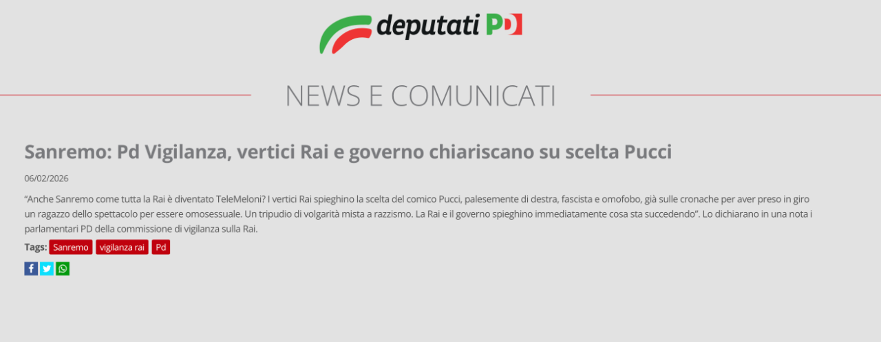 extermination Inviato Lunedì alle 15:29 Condividi Inviato Lunedì alle 15:29 Ai - “La Commissione parlamentare per l'indirizzo generale e la vigilanza dei servizi radiotelevisivi (nota come Vigilanza RAI) è un organo bicamerale che vigila sull'imparzialità, il pluralismo e la qualità dell'informazione del servizio pubblico RAI. I suoi compiti principali includono formulare indirizzi generali, garantire il rispetto delle regole di par condicio, controllare i contenuti dell'informazione e le Tribune Politiche/elettorali” Link al commento https://melius.club/topic/28367-pucci-co-conduttore-a-sanremoanzi-no/page/11/#findComment-1694654 Condividi su altri siti Altre opzioni di condivisione...