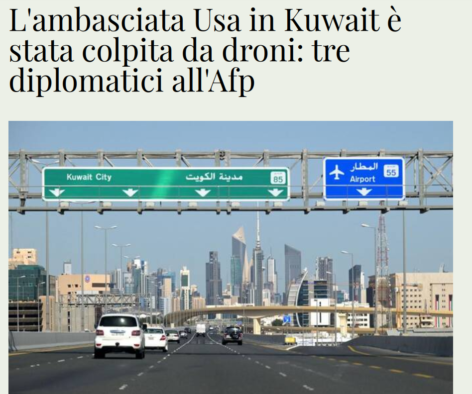 Plot Inviato 2 Marzo Condividi Inviato 2 Marzo Scoop: - - " KUWAIT: L’ambasciata degli Stati Uniti in Kuwait è stata colpita da droni, hanno detto tre fonti diplomatiche all’AFP dopo che lunedì si è visto il fumo che si alzava dalla missione diplomatica. Un diplomatico con sede in Kuwait e un diplomatico occidentale, parlando a condizione di anonimato, hanno detto che l'ambasciata era stata danneggiata da un certo numero di droni mentre un secondo diplomatico con sede in Kuwait ha detto che l'edificio dell'ambasciata era stato colpito direttamente nell'attacco." Link al commento https://melius.club/topic/28610-iran-si-comincia/page/39/#findComment-1710220 Condividi su altri siti Altre opzioni di condivisione...