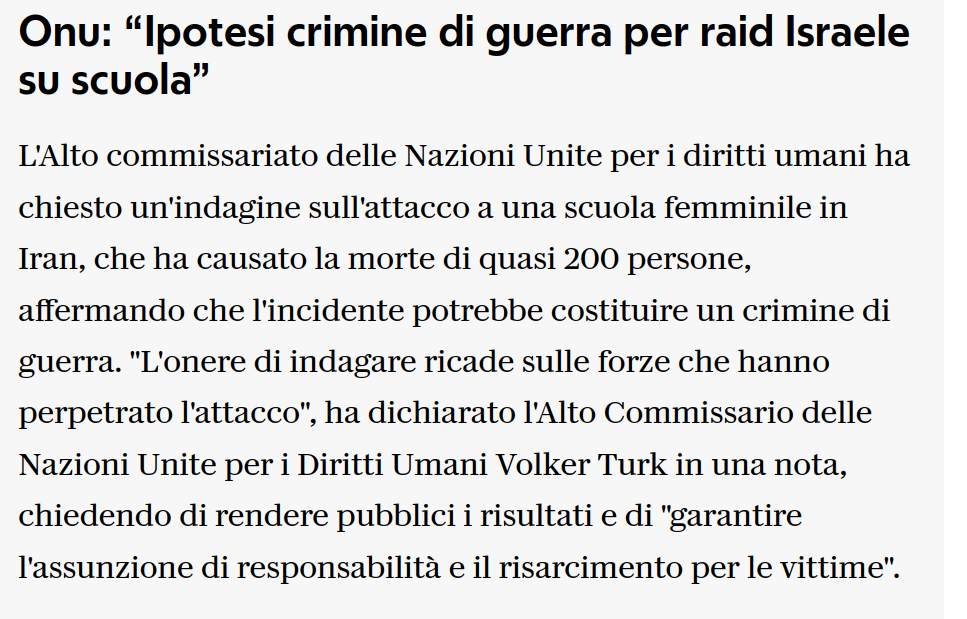 saperusa Inviato 11 ore fa Condividi Inviato 11 ore fa @Plot Ripeto, ovvio che lato Iran danno la colpa a Israele o se preferisci Stati Uniti. Ho fatto la stessa domanda __________________________________________________________________________________________________ Solo una domanda, la scuola colpita con le vittime si è riuscita a capire da chi è partito il colpo? Perché lato israeliano danno come responsabile un errore ad opera delle guardie rivoluzionarie. Vicino alla scuola ci sta un edificio dei pasdaran dove probabilmente hanno lanciato dei missili. Oppure è un errore di calcolo israeliano? Israele continua a smentire, anche a distanza di tempo. Info di Israele dicono che era impossibile che siano stati loro perché l'attacco era alle 7 ora di teheran e la scuola in quel momento era chiusa. ________________________________________________________________________________ Questa la riposta GED (Geopolitica Esteri Difesa) Difficile un errore. Le armi occidentali di solito sono precise come si è visto nel bombardamento della residenza di Khamenei. L'ipotesi più probabile è un detrito arrivato proprio lì o di un missile intercettato o di uno intercettatore anche perché la scuola molto vicina a una base navale dei pasdaran. Difficile capire se le immagini siano quelle in assenza di corpi. All inizio la scuola era localizzata in due posti diversi. Anche il numero delle vittime balla considerevolmente. Si è arrivati in un comunicato a 148. Il governo iraniano parlava di 203 morti in tutto. Difficile chec148 siano solo lì ma Difficile che siano solo 203. Propaganda e basta? Non credo altrimenti avrebbero comunicato una serie di episodi di questo tipo non uno solo. Ma è difficile capire la situazione reale. __________________________________________________________________________________________________ Link al commento https://melius.club/topic/28610-iran-si-comincia/page/44/#findComment-1710569 Condividi su altri siti Altre opzioni di condivisione...
