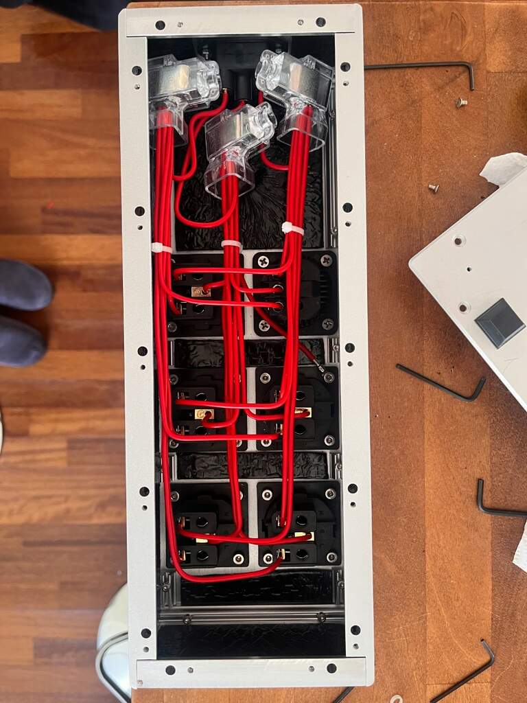 io ho cablato la mia ciabatta con prese Furutech rodio NCF con cavo Neotech rame solid core da 12. Sto ora pensando se ho sbagliato, e se la ciabatta sia troppo caratterizzante forzandomi ad orientarmi su una determinata tipologia di cavi di alimentazione per compensare. Ma è un’ottima ciabatta, costruita molto bene e pagata abbastanza, chiaramente non rivendibile a cifre sensate come tutti i prodotti autocostruiti..