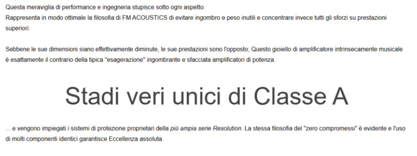 Se leggi tutta la pagina vedrai che non si dice nessuna delle due cose, anche se nella descrizione in basso parla solo di stadi di ingresso in classe A. Leggi la pagina per intero sul loro sito. Ma non è questo il punto e neppure mi interessa, mi interessa il fatto che suonino bene tanto da stare in vetta alla classifica di TAS per i migliori ampli al mondo con costo superiore ai 20.000$ , pur pesando 4,5 Kg ciascuno. Vuol dire che i vecchi assiomi toroidale da 15 Kg e condensatori grandi come lattine di birra ( eh sì, questo riportavano i recensori un tempo) non è più segno di alimentazione migliore di una alimentazione leggera. E se non sono in classe A meglio, testimonia che non serve più per essere al top degli ampli a stato solido al mondo . Non è un prodotto cinese è un prodotto dell'azienda n 1 per qualità del suono degli amplificatori, glielo riconosce quasi chiunque mi pare, quindi spero che quando i cinesi fanno ampli da 4,5 Kg nessuno li irrida senza averli ascoltati e provati come si deve...