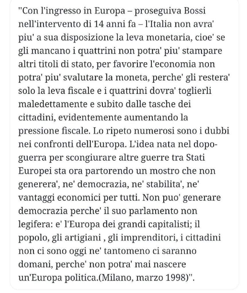 Guru Inviato Lunedì alle 07:50 Condividi Inviato Lunedì alle 07:50 Ma dai che Bossi era un fallito nella vita, persona senza arte né parte... Un avventuriero senza niente da perdere che ha saputo intercettare un malcontento... Non è che Roma l'ha contagiato, quello era senza scrupoli già da prima. Stiamo dicendo che tutti i politici che vanno a Roma si inguattano 49 milioni di euro? Link al commento https://melius.club/topic/28821-il-senat%C3%B9r-non-c%C3%A8-pi%C3%B9/page/7/#findComment-1724984 Condividi su altri siti Altre opzioni di condivisione...