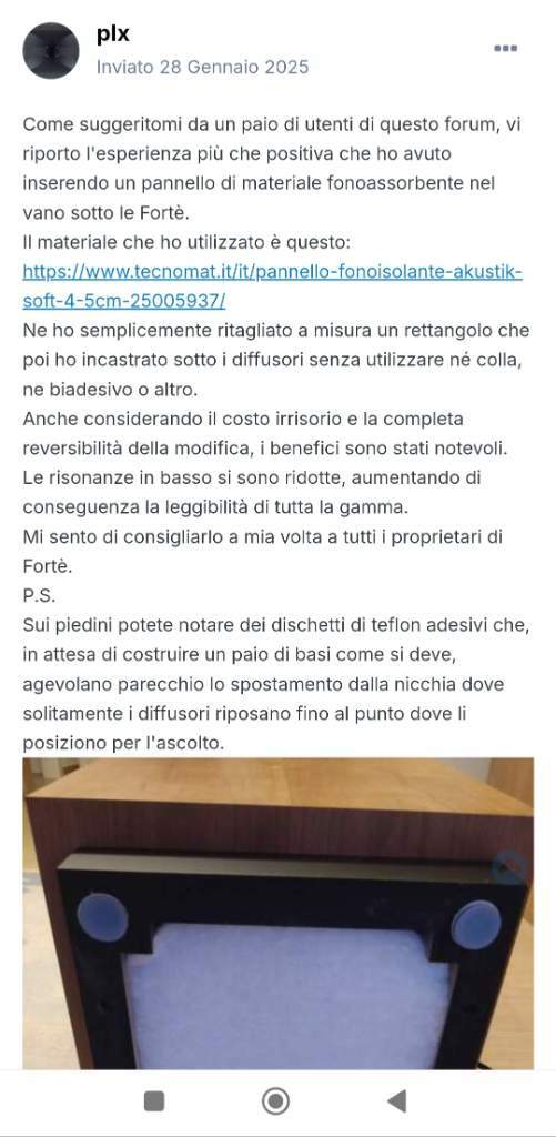 ildoria76 Inviato Giovedì alle 21:39 Condividi Inviato Giovedì alle 21:39 6 ore fa, Kat62 ha scritto: Quando,le toglierò dall'imballo, prima di rovesciarle, le misure dell' apertura della base le prenderò io e le posterò comunque vada.,👍 Proverò a mandare un messaggio a @ildoria76 Purtroppo mi hanno disabilitato la messaggistica su questo forum, è quindi impossibile inviarmi messaggi. In ogni caso il materiale che ho usato è il polietilene espanso a cella chiusa, ma anche quello a cella aperta fa bene il suo lavoro. Suggerisco se riuscite di trovare degli spessori che riescono a riempire completamente il vuoto dello zoccolo. Per quanto riguarda le misure da ritagliare questo weekend dovrei proprio lavorare per una nuova modifica che potrebbe essere molto interessante, e con l'occasione mi segnerò le misure...per le Forte IV, le III credo siano diverse 1 Link al commento https://melius.club/topic/5716-il-circolo-del-colonnello-klipsch/page/297/#findComment-1712490 Condividi su altri siti Altre opzioni di condivisione...