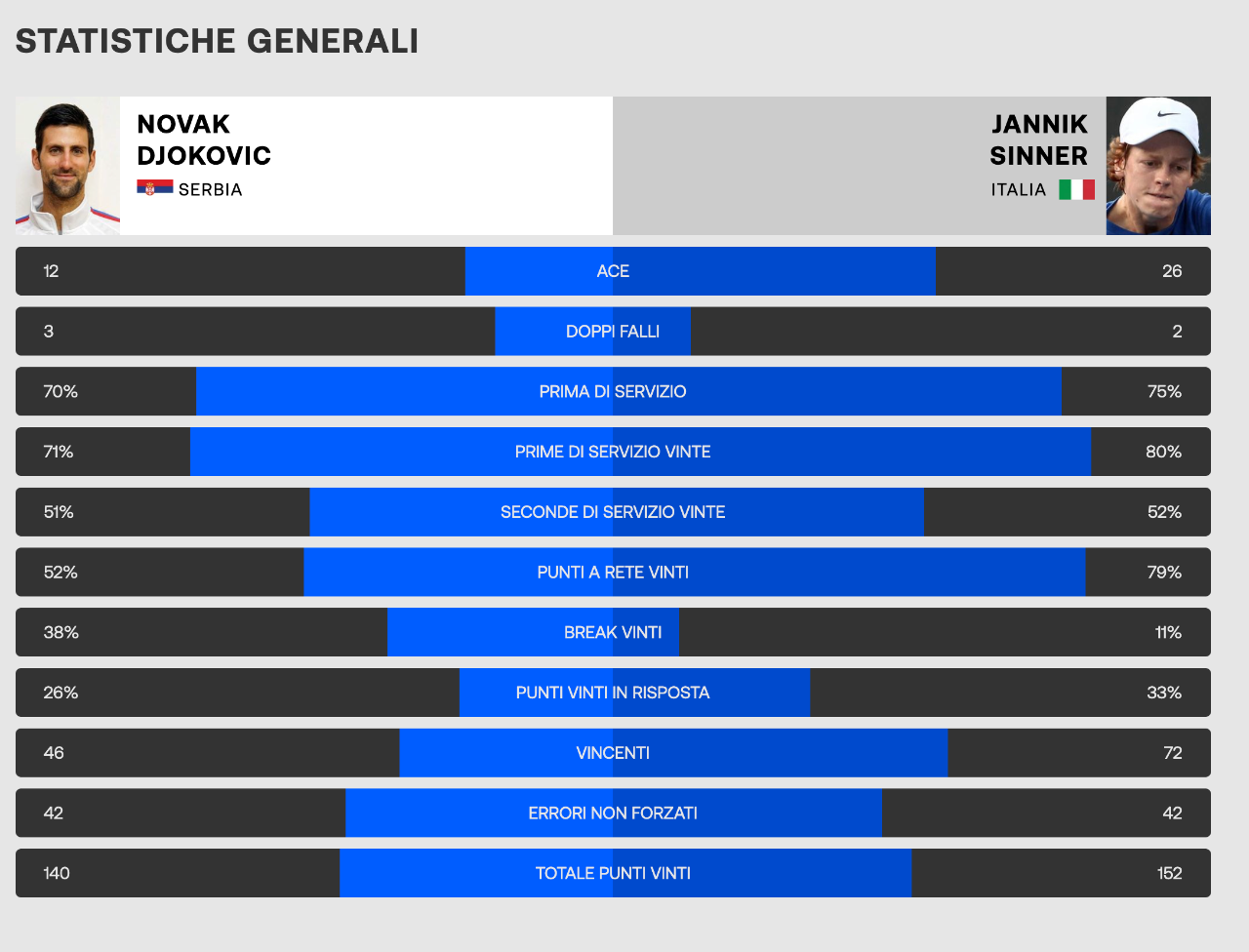 regioweb Inviato 30 Gennaio Condividi Inviato 30 Gennaio 2 minuti fa, ascoltoebasta ha scritto: quando si giocano sempre gli stessi colpi,i veri campioni trovano le contromisure ma quali contromisure… Sinner oggi semplicemente non è stato all’altezza dei suoi livelli standard se non sul servizio (26 ace e un 75% complessivo di prime) il problema è stato negli scambi interlocutori, quando ha avuto l’occasione di affondare il vincente spesso non l’ha fatto o ha giocato palle poco profonde o poco angolate concedendo a quel diavolo di Nole di capovolgere a suo favore lo scambio … del resto basta guardare i numeri del match per capire che più che averla vinta Nole (comunque immenso, chapeau…) l’ha persa Sinner pazienza sarà per la prossima 1 Link al commento https://melius.club/topic/811-tennis-thread-unico/page/553/#findComment-1687361 Condividi su altri siti Altre opzioni di condivisione...