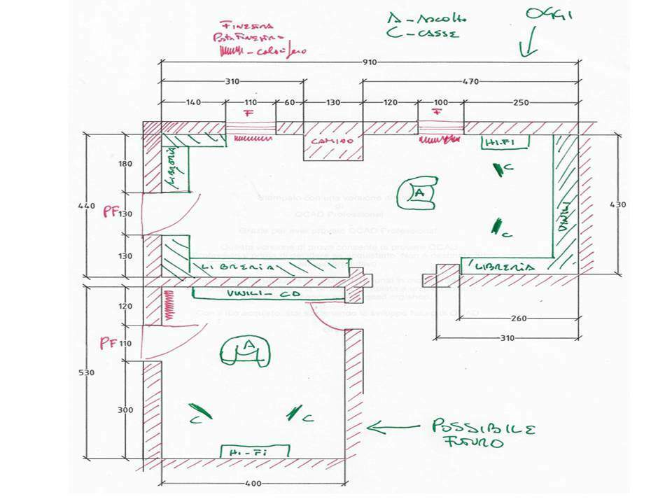 sono a voi per un consiglio, mia figlia ha "concesso" che utilizzi il suo studio spostando i suoi libri nella sala biblioteca così da poter avere una stanza della musica. Nella planimetria, scusate se orrida, che vedete vi sono le due situazioni: attuale e futura.