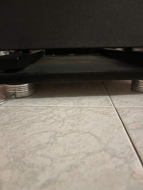 Il montaggio richiede un po’ di coraggio perché bisogna intervenire sul telaio dei pannelli, ma una volta terminato il lavoro la sensazione è che il diffusore diventi strutturalmente più fermo, quasi più “in tensione”. Nel mio caso i pannelli sono anche disaccoppiati dal pavimento tramite molle ad aria Moss collegate a serbatoi da 5 litri, soluzione che trovo molto efficace per stabilizzare ulteriormente il sistema.